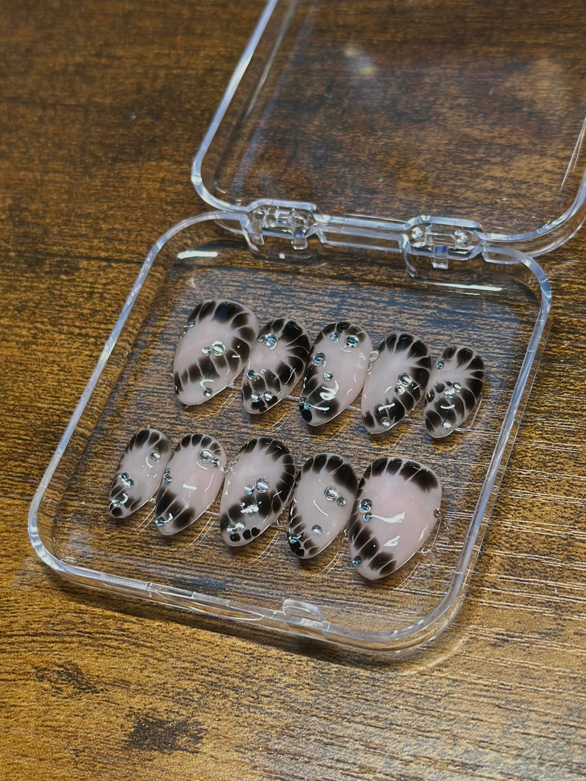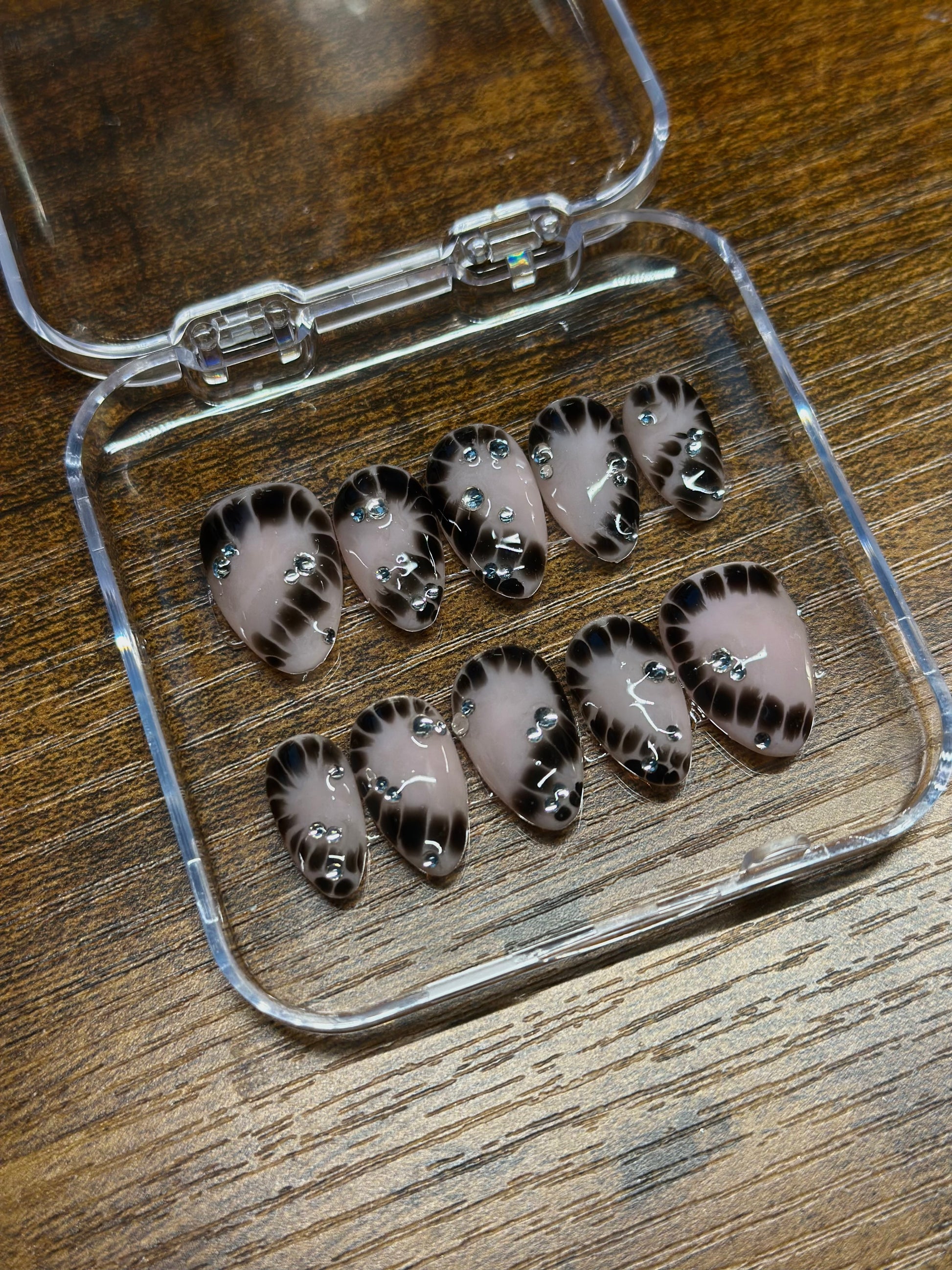 Wear these beautiful and elegant press on nails. Black blooming gel with silver rhinestones. If you're looking for something that looks like it came out of the salon but is affordable these are for you.