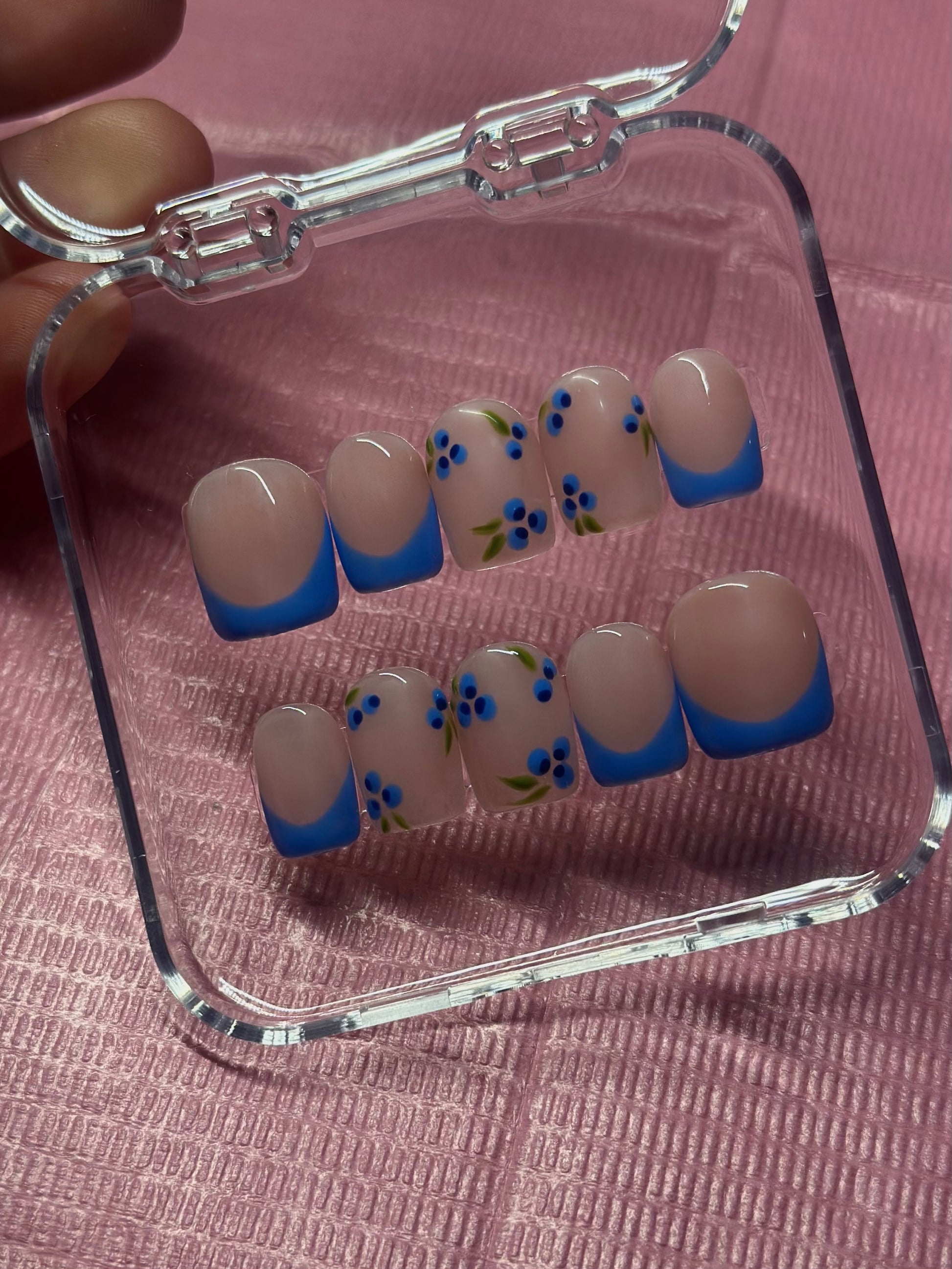 Blue French Tip with Blueberries | Hand Painted Press On Nails | Custom Sizing and Shape | Great for Summer, Holiday, or Gift
