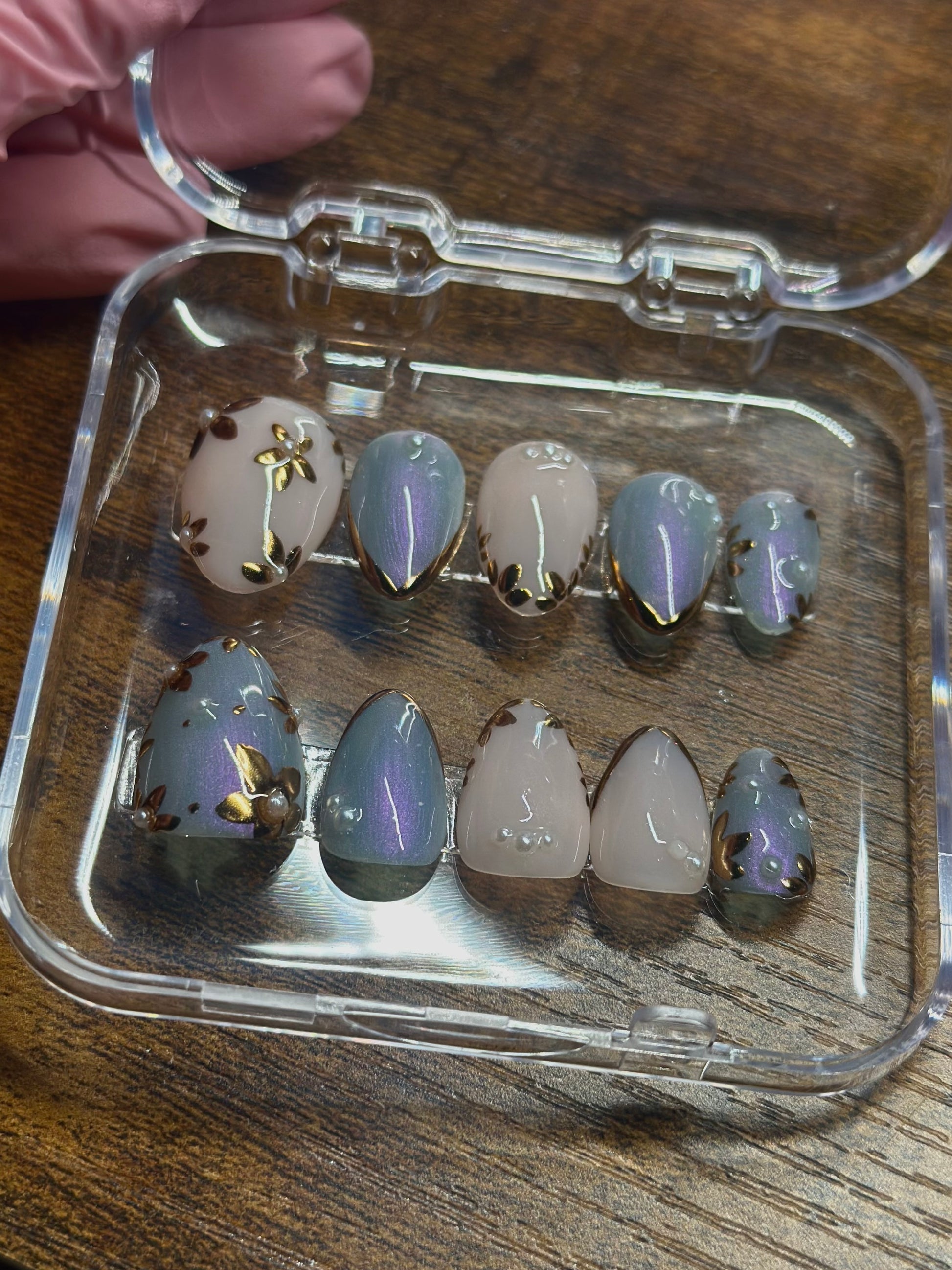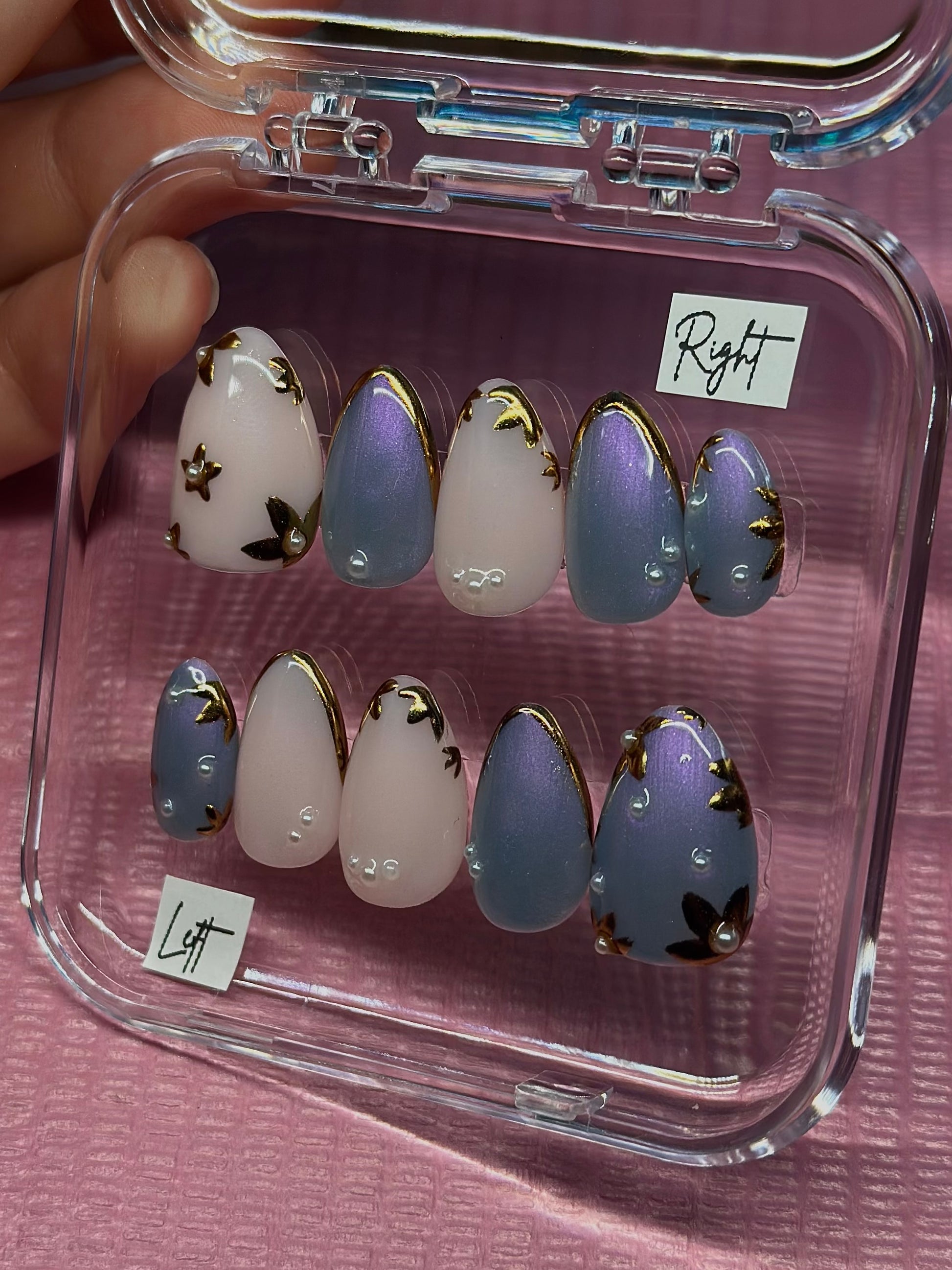 Blue Purple Cateye Press on Nails | Chrome Flowers | Hand painted, Gel Manicure, Durable, Reusable Presson Nails, Summer Nails