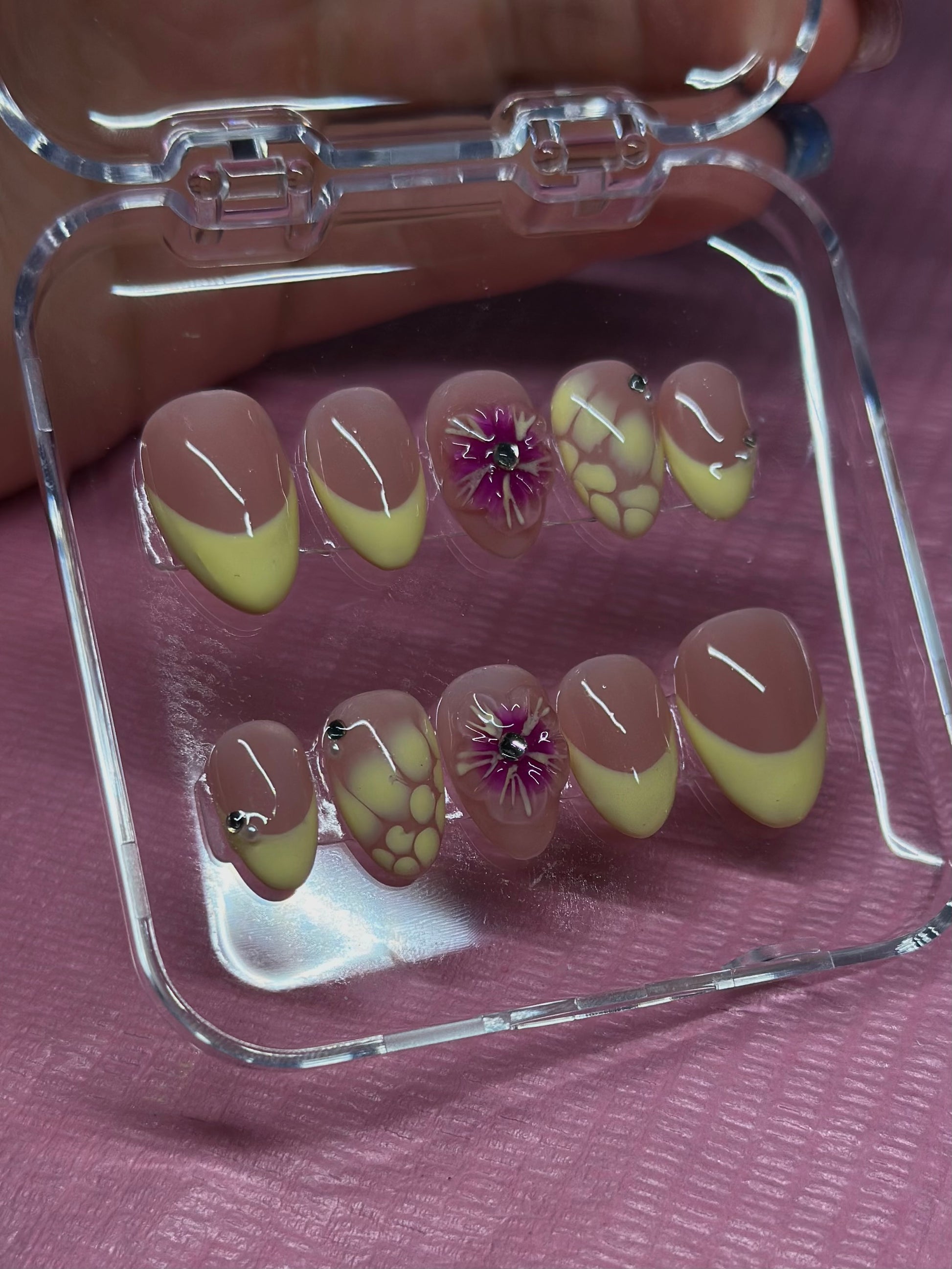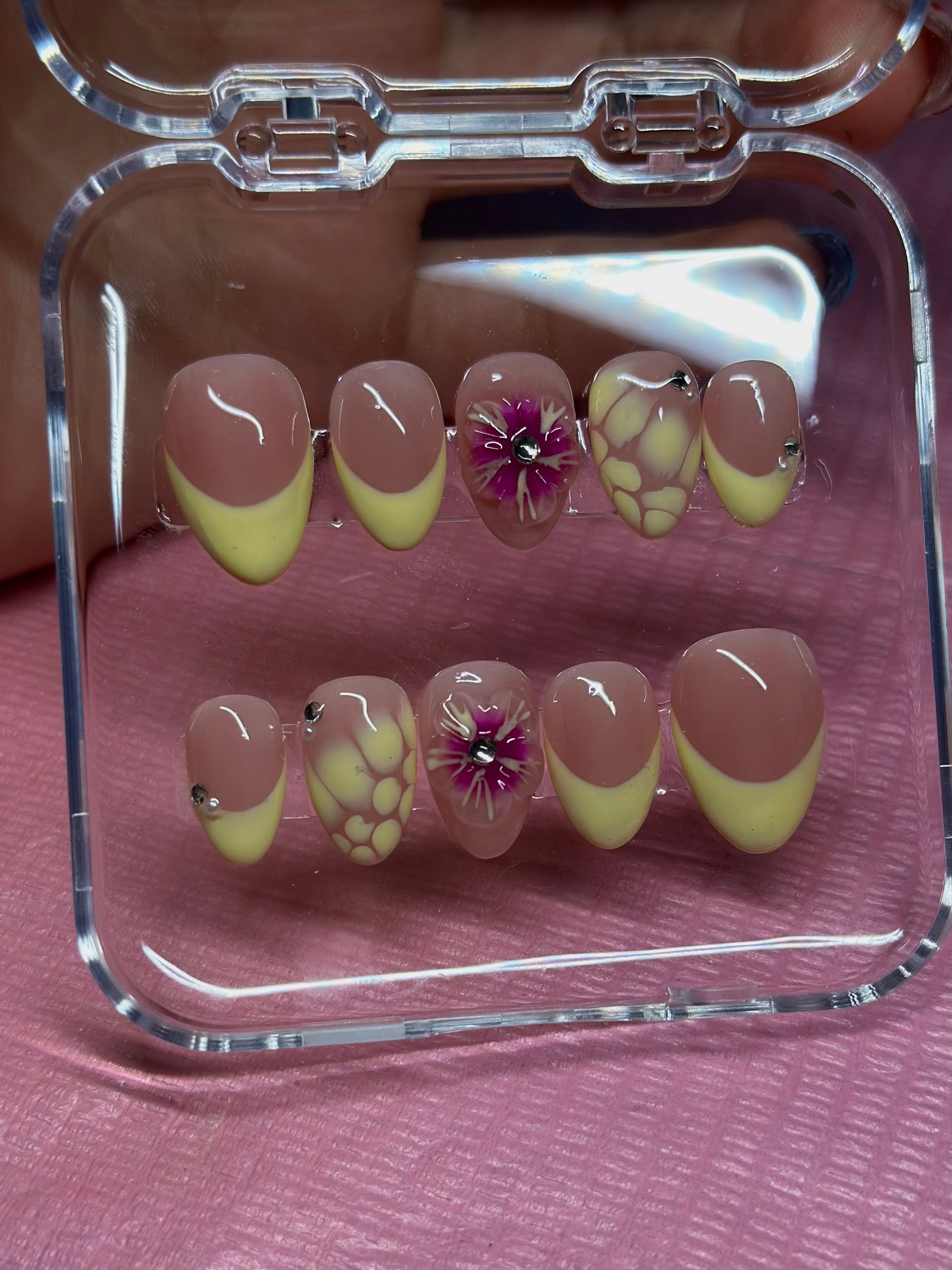 Wear these beautiful butter yellow nails with cute 3D flowers. Elegant and on trend. Perfect for everyday use. Each set is hand painted by me! If you're looking for something that looks like it came out of the salon but is affordable these are for you.